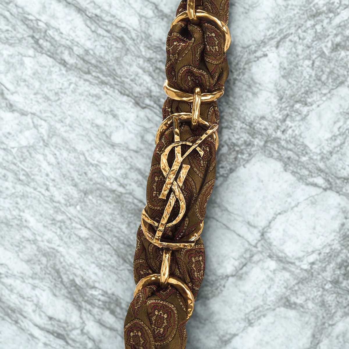 THE SAINT LAURENT AMALIA IN JACQUARD – PREMIUM QUALITY COMBINES LUXURIOUS DESIGN WITH STRIKING JACQUARD FABRIC IN A MEDALLION PATTERN. ITS SOFT, FLAT SILHOUETTE IS ACCENTUATED BY A BRAIDED CASSANDRE CHAIN IN BRONZE FINISH – PERFECT FOR A STYLISH LOOK WITH MAXIMUM COMFORT.
